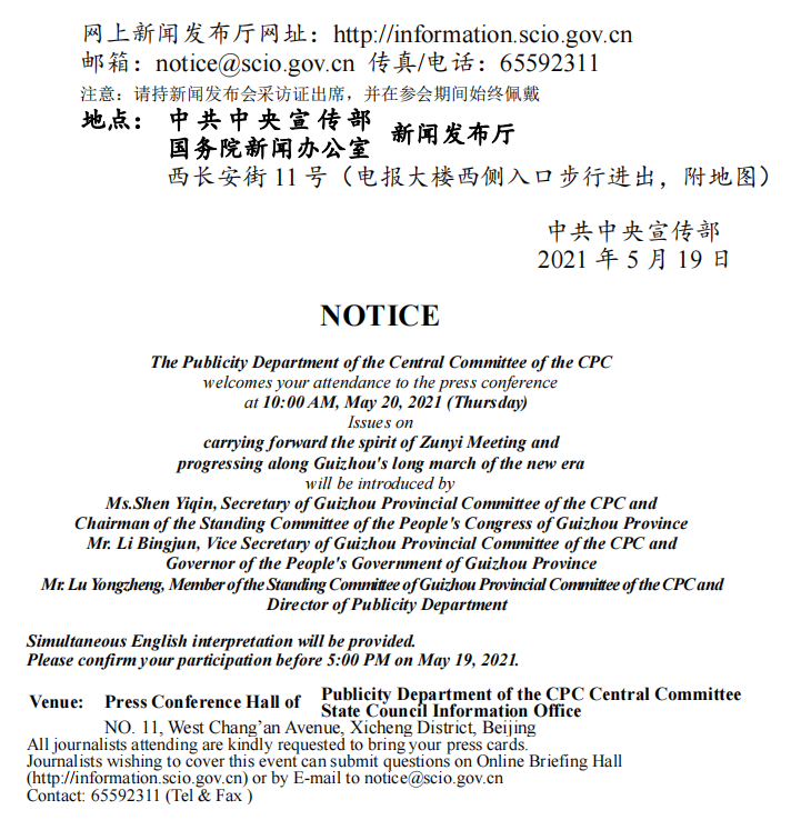 中共中央宣传部定于2021年5月20日(星期四)上午10时举行新闻发布会,请中共贵州省委书记、省人大常委会主任谌贻琴,中共贵州省委副书记、贵州省人民政府省长李炳军,中共贵州省委常委、宣传部部长卢雍政围绕“弘扬遵义会议精神,走好贵州新时代的长征路”主题介绍情况,并答记者问。